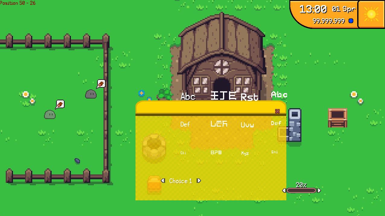 Naturally fonts are also an important part of the game. Thankfully I assigned myself enough time to find and evaluate fitting fonts. Here you can see 4 chosen fonts. The left one is supposed to be rather clear and used for things that need to be easy to read like settings or your money (slimes) in the top right corner. The second font may be used for some nice little riddles using hyroglyphes. The next two may be used for highlighted texts or perhaps NPC message boxes. Notice, that I implemented a nice little "shadow" as I like to call it for the texts to be more readible. For example "Abc" or all the fonts in the widget have that.