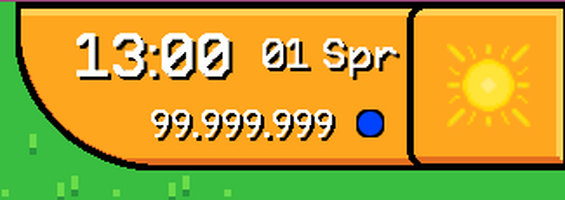 This is the actual cool thing here! Check out the top right corner - it might seem familiar as these kind of widgets are in all kinds of farming games. I hope this will feel familiar as well and even though it is not polished and not even working yet, it pretty much conveys what to expect from it. You can see the time, which is going to listen to the game clock in the future. The actual date and season as well as the weather. These are supposed to be from a special service just for these infos as well. And lastly we have the money. Right now I think the game economy will work around slimeballs that you can collect instead of money, but this might change in the future. The icon also needs a slight and easy refactor.